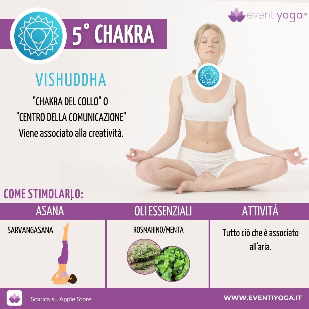 Il quinto chakra si chiama Vishuddha ed è situato alla base del collo. Il suo colore è il blu e rappresenta l’espressione autentica di se stessi attraverso le parole ed i gesti. Un quinto chakra bilanciato ci permette di esprimere i nostri sentimenti in modo chiaro e sincero.