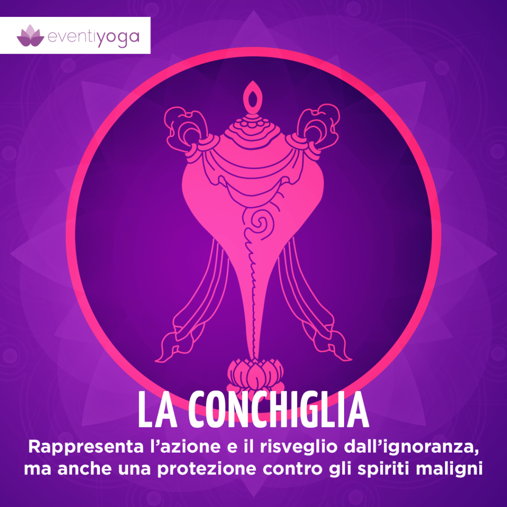 Simbolo dai molti significati. Usato come chiamata alla battaglia, rappresenta l’azione e il risveglio dall’ignoranza, ma anche una protezione contro gli spiriti maligni. La conchiglia viene usata attualmente nella religione buddista per chiamare alla raccolta l’assemblea religiosa che con la sua melodia risveglia e accompagna gli accoliti agli insegnamenti del Buddha.