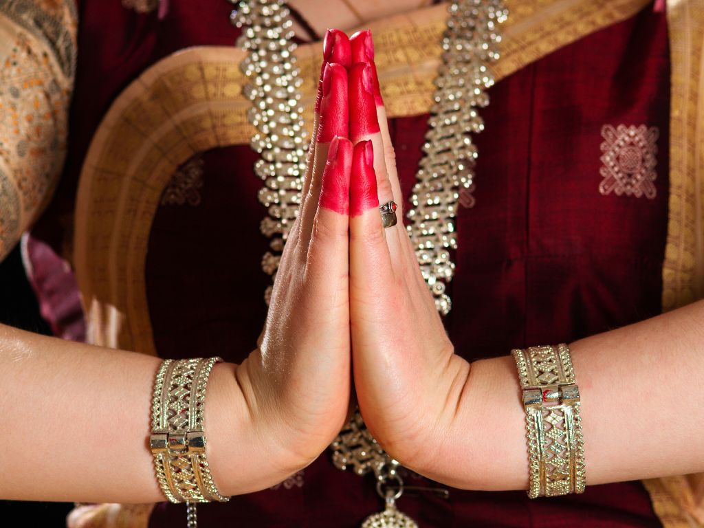 Se davanti a voi c’è una persona molto importante, allora prima piegate le mani e portatele di fronte al terzo occhio. Fatto questo, potete far scendere le mani all’altezza del cuore. Questa sequenza significa simbolicamente che la nostra mente si abbassa davanti al nostro cuore e che diamo più importanza all’anima che alla ragione.