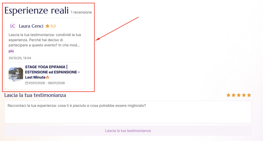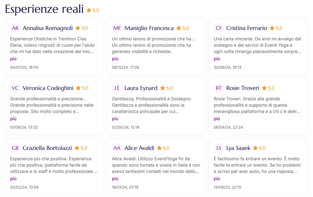 Su EventiYoga le recensioni si chiamano “Esperienze reali” e appaiono direttamente sulla scheda del tuo evento o del tuo profilo.